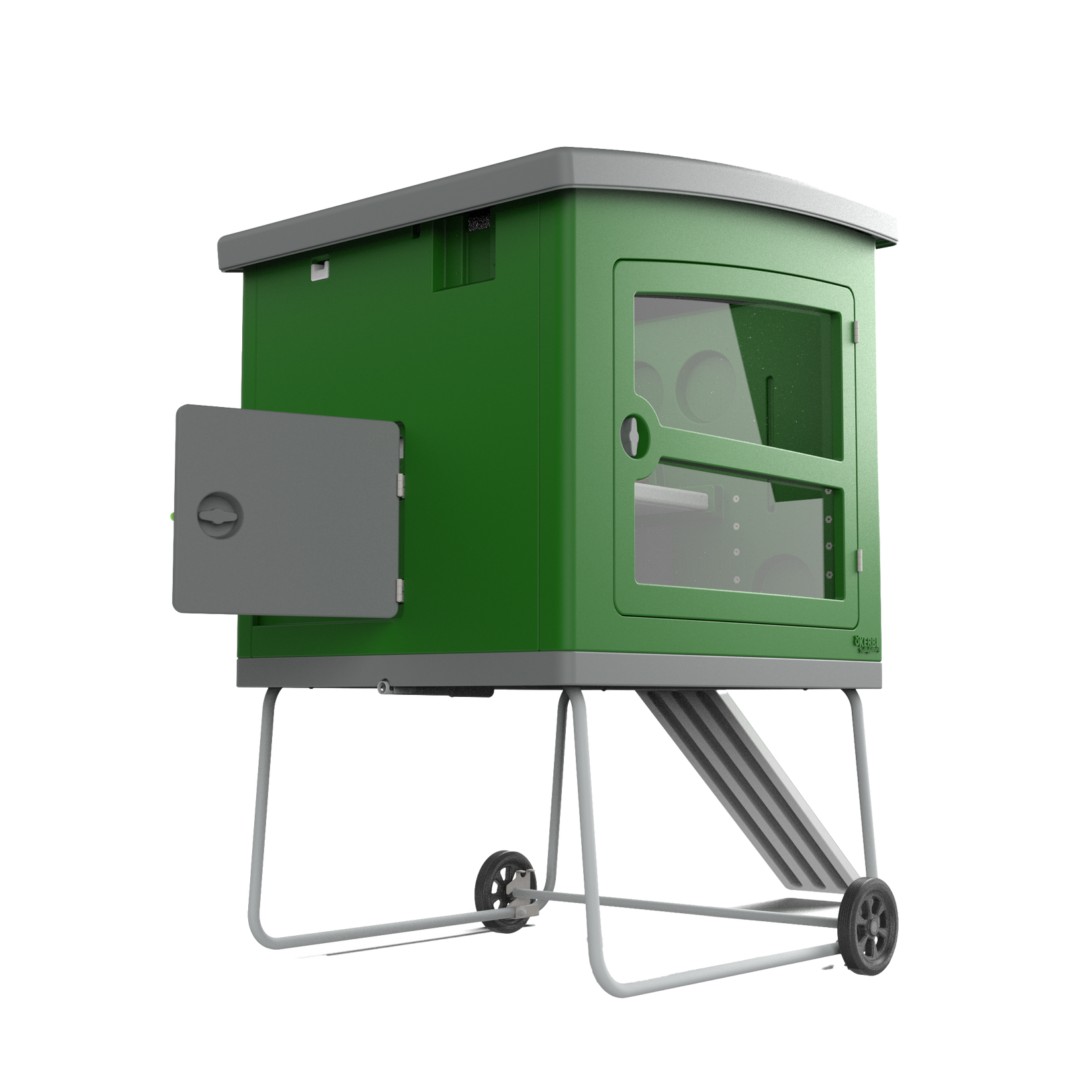 Der innovative Mobile Coop kombiniert wichtige Tierwohlstandards mit ansprechender Optik und verbesserter Ergonomie für den Tierhalter. Die robuste Verfahreinheit ermöglicht eine flexible und tierartgerechte Hühnerhaltung auf Grünflächen.